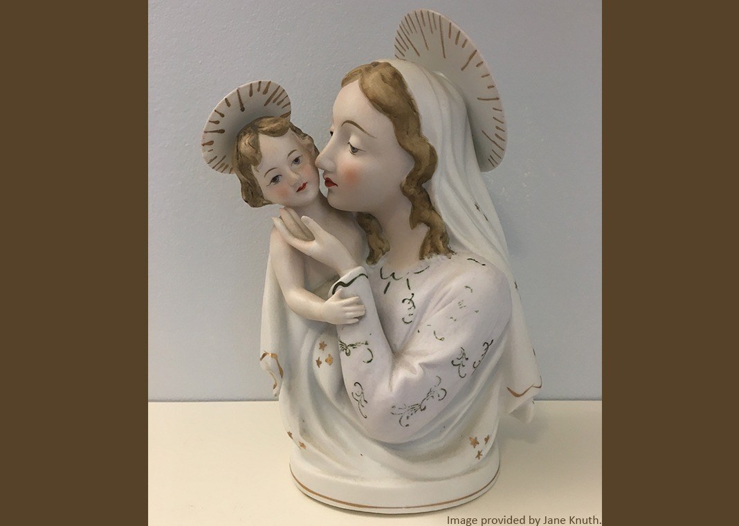 Nowadays, Mary and Baby Jesus reign over my guest room, welcoming all who stop to rest for the night. She reminds me of my mom’s strong faith. She also tells me that the miracle of growing up in a large family without a chip in the glaze is entirely possible—with prayer, of course.